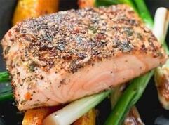 Makan tengah hari: Salmon panggang dengan mustard, kaserol dari keju kotej, galet ducan.
